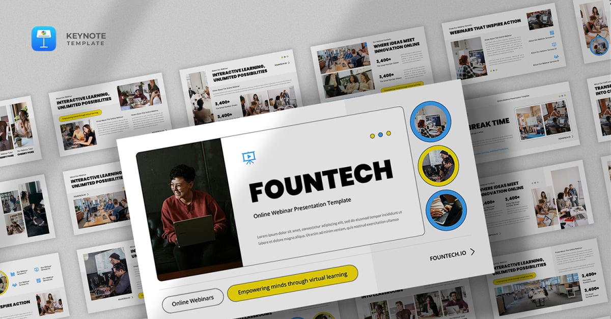 Fountech – Webinar Course Keynote Template Online Course & Seminar, E-Learning Education, Webinar, E-Course – Keynote Template — Simple, clean, minimalist, modern, and professional presentation template. It is a multipurpose business presentation template. Perfect for online course, webinar, e-learning education, e-course, online seminar, teacher, online class, conference, training, workshop, project proposal, startup…