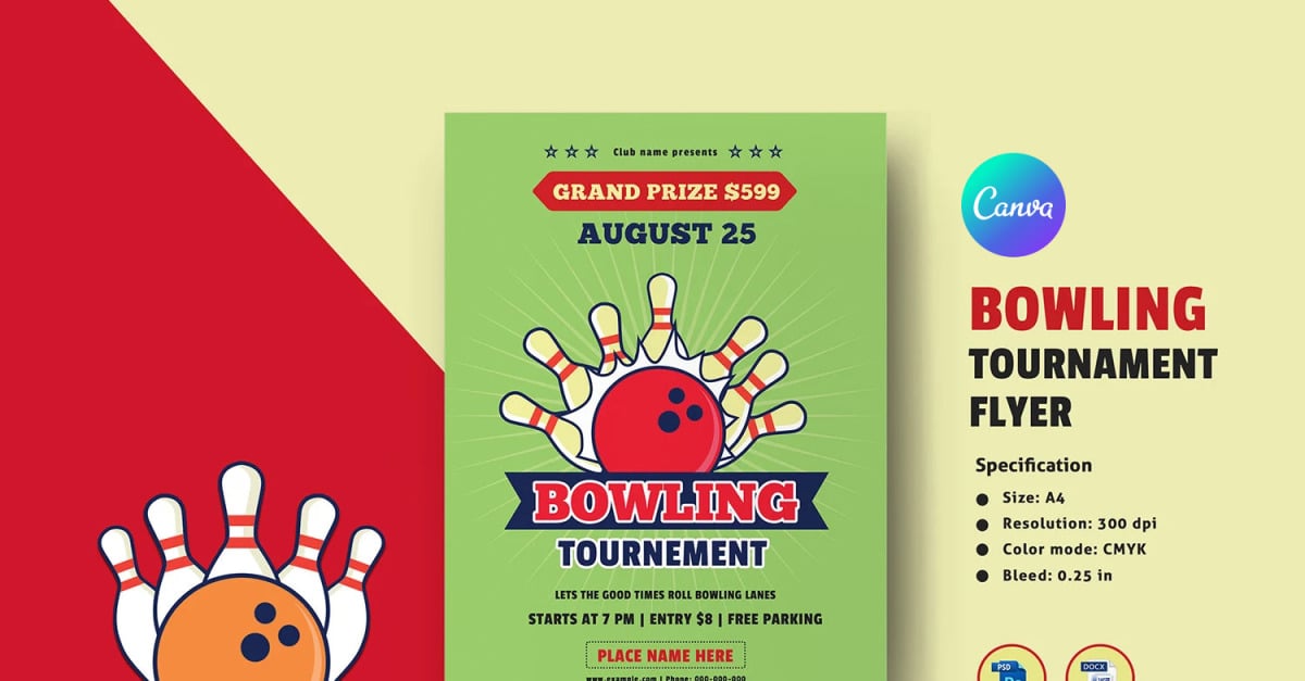 Printable Bowling Tournament Flyer Template, perfect for promoting leagues, competitions, or bowling events. Modern, editable design for sports clubs and event organizers. This is not a mock-up FILE INFORMATION Size:A4Resolution: 300 dpiColor mode: CMYKBleed: 0.25 inWorking file: Photoshop cs2 or Later version, photoshop elements & MS WordFiles included: Photoshop cs6 (psd) & MS Word (DOCX)Font…
