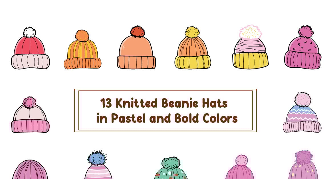 13 Knitted Beanie Hats in Pastel and Bold Colors
