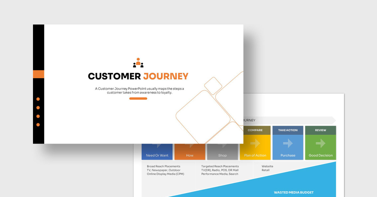 A customer journey PowerPoint presentation describes and visualizes the steps a customer takes when interacting with a brand, from initial awareness to post-purchase loyalty. These presentations use templates with stages like awareness, consideration, purchase, and advocacy, outlining customer touchpoints, emotions, and challenges to help organizations improve customer experience, identify pain points, and drive strategies for increased satisfaction…