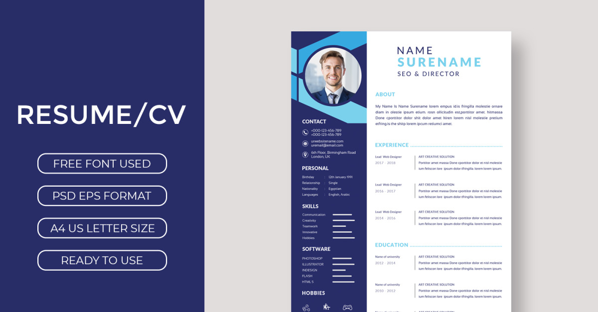Overview : Modern and professional Resume/CV Template to help you stand out. Designed with a clean layout, it’s easy to edit in PSD, AI, or EPS. Perfect for any profession, from business to creative fields. Make a strong first impression with a polished, eye-catching resume! This Product Includes: – Compatible files for Adobe Photoshop CS/CC…