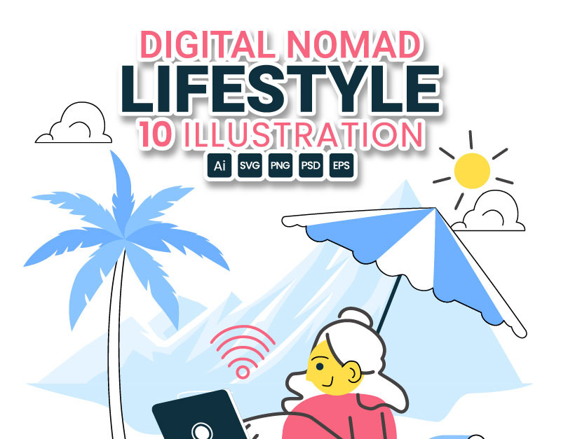 Digital Nomad Lifestyle Vector Illustration Featuring People Working Remotely While Traveling and Enjoying a Holiday in a Flat Style Background Suitable for Poster, Web Banner, Brochure, Landing Page and Others Background Template Features: – Fully editable vector files, easy to edit the object, color and background – Include 100% vector Ai, Eps 10, SVG –…