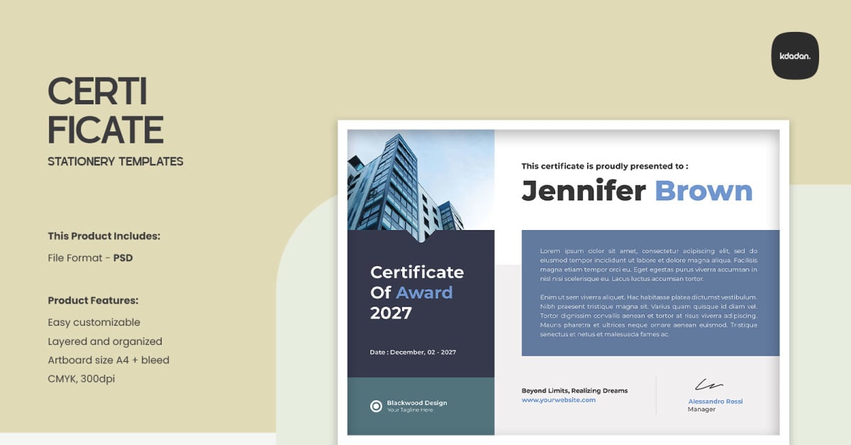 Overview : Clean, Modern and Professional Certificate. Fully customizable, easy to use and replace colors & text, logo containers are Smart-Objects to make it easy for you to add logo and edit files. This Product Includes: – Compatible files for Adobe Photoshop CS/CC – Help Files Product Features: – Fully customizable and editable PSD template…